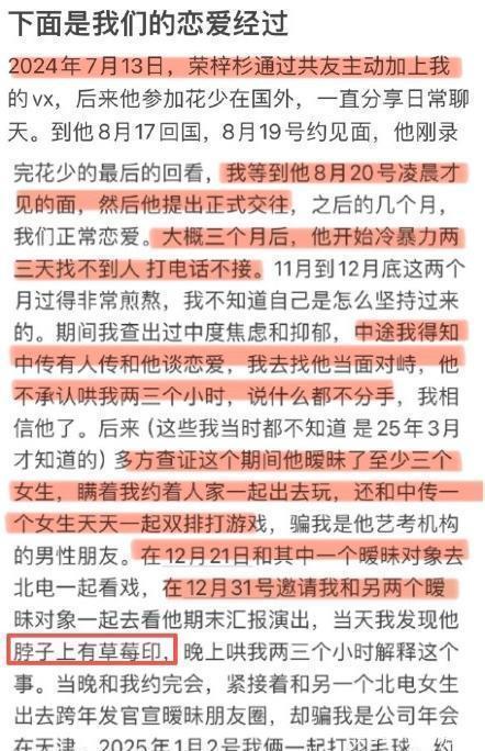 除了这些,大家应该都知道,荣梓杉年以专业课第一的成绩考上了中戏。不过可能有些人不知道的是,荣梓杉在高考的时候背刺了艺考群主,假装说要考某个学校,实际上是偷偷进群打探情况,考试一结束就把群主拉黑了,结果群主也把这事儿给捅出来了。这事儿在网上没闹腾多久,就被荣梓杉的工作室否认了,是真是假还得再看看。