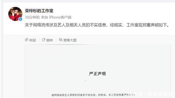 截止到发稿前,荣梓杉的工作室对于这件事情也做出了回应,发布了《严正声明》,工作室首先否定了传言,并且表示,荣梓杉和女方从来都没有建立任何恋爱关系,所以也并不存在所谓的“恋爱”、“出轨”等情况。